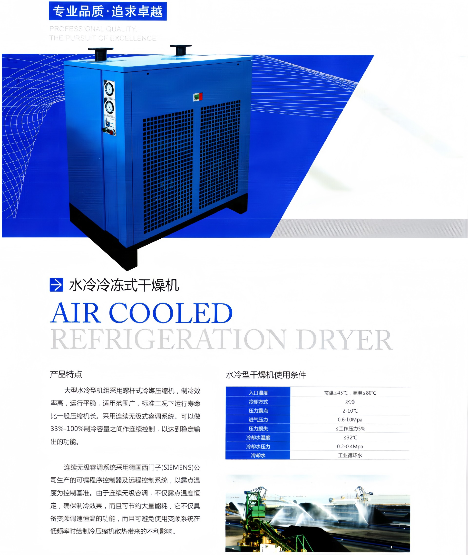 产品描述:工况条件与技术指标进气温度(Inlettemperature):≤45℃冷却方式(Coolingmethod):水冷(Water-cooling)压力损失(Pressuredrop):≤0.02Mpa压力露点(Dewpoint):2~10℃冷却水进口温度(Coolingwaterinlette···